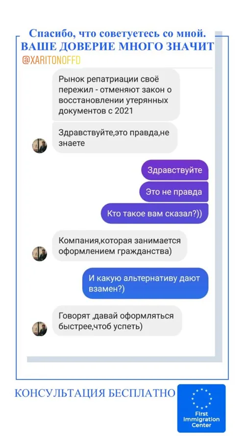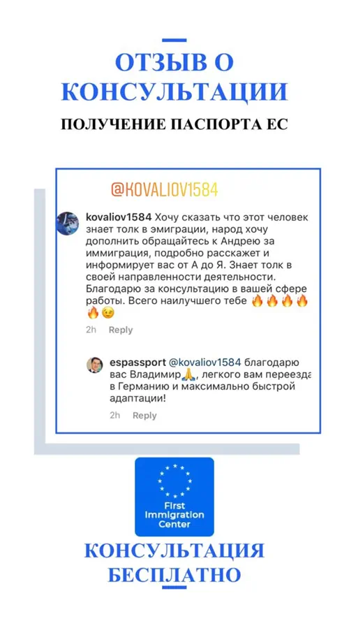 Консультации наших адвокатов и оценка ваших шансов на получение гражданства Европы или ВНЖ всегда бесплатны. Мы берем деньги только за конкретную работу по вашей иммиграции или релокации бизнеса.